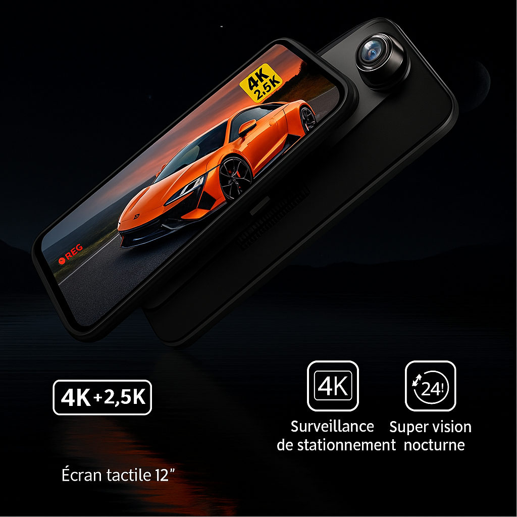 Écran 12 pouces, qualité 4K avant / 2.5K arrière,vision nocturne avancéeetsurveillance 24h/24.